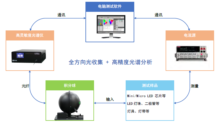 系统组成:高性能阵列式光谱仪,直径300mm积分球,真空吸附半导体温控台,标准灯,ISG测量软件