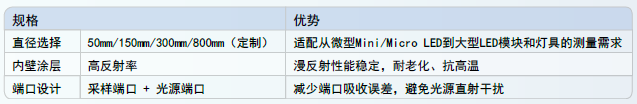 积分球内壁直径为300mm,该尺寸适合microLED的光通量测试。其它尺寸的积分球可进行定做。